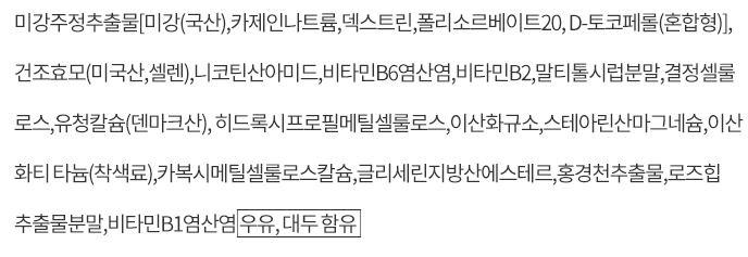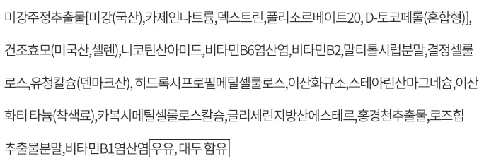 특이체질과 알레르기 체질의 경우 개인에 따라 과민방응이 나타날 수 있으므로 원료 확인 후 섭취해주세요. 제품에 검은색 점박이는 원료에서 기인한 것으로 안심하고 섭취해도 됩니다.