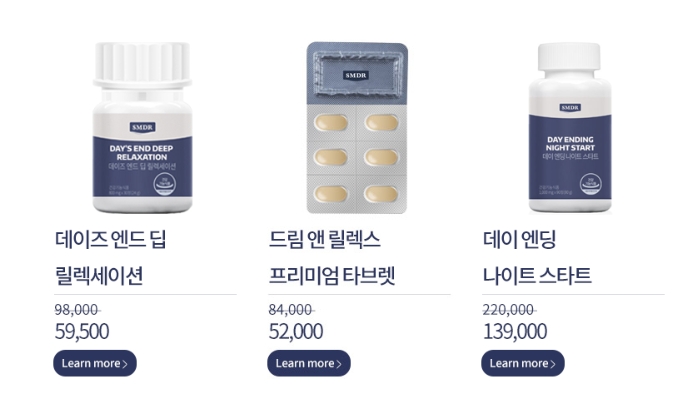 SMDR 수면영양제는 데이즈 엔드 딥 릴렉세이션, 드림 앤 릴렉스 프리미엄 타브렛, 데이엔딩 나이트 스타트로 구성되어 있습니다. 이 중 가장 많이 판매되는 제품은 데이즈 엔드 딥 릴렉세이션입니다.