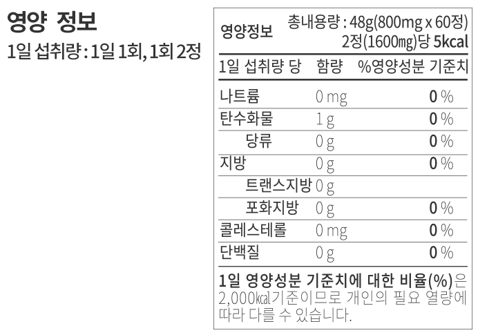 주의사항 특이체질과 알레르기 체질의 경우 개인에 따라 과민방응이 나타날 수 있으므로 원료 확인 후 섭취해주세요. 영유아, 어린이, 임산부 및 수유부는 섭취에 주의하세요. 의약품(항히스타민제 또는 중추신경계억제제)과 병용섭취 시 주의하세요. 유통기한이 경과된 제품은 섭취하지 마세요.