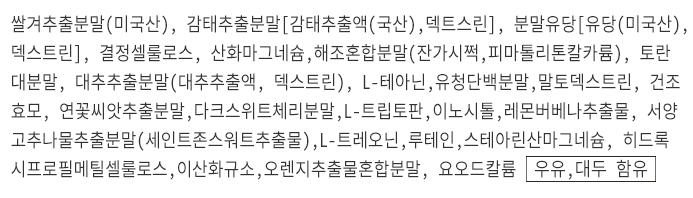 감태는 다시마목 미역과에 속하는 해조류로 뿌리를 제외환 잎이 식용으로 사용됩니다. 식물유래 성분으로 안전하다고 알려져 있습니다. 그밖에 쌀겨추출분말과 감태추출분말과 함께연꽃씨앗추출분말, 루테인, 오렌지추출혼합분말 등이 함유되어 있습니다.