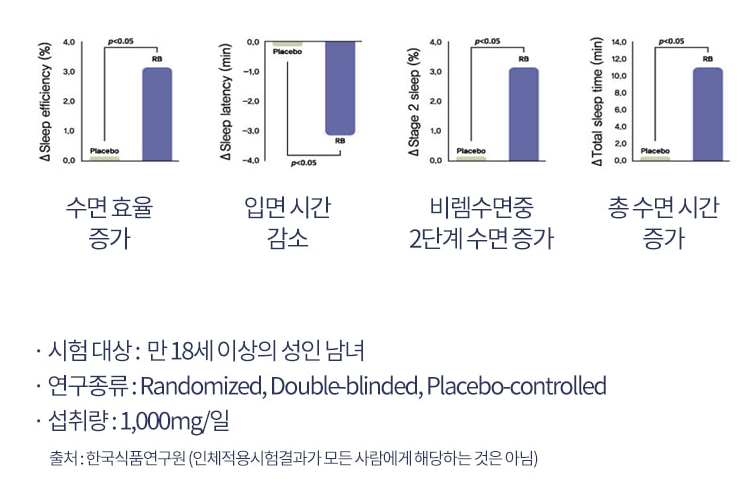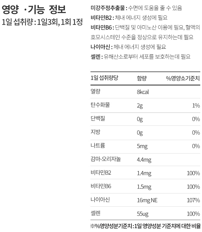 미강추정추출물을 기반으로 만든 건강기능식품으로 수면시간 증가에 도움을 주고 비타민 B군은 수용성 비타민으로 우리 몸에 활력을 줍니다.